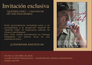 El municipio será escenario de una velada cinematográfica única con la proyección exclusiva de la película “Querido Fidel”, dirigida por la realizadora italiana Viviana Caló. El evento, programado para el próximo 23 de abril de 2026 a las 5:00 p.m. en el Teatro Magdalena, reunirá a invitados especiales y público local en una noche que promete convertirse en un hito cultural para la región.