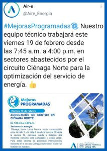 Mediante un comunicado de prensa la empresa Air-e informa a sus usuarios, que el día de hoy 19 de febrero se realizará una suspencion en el servicio por motivo de realizar labores de mejora en la infraestructura. Se publica el mensaje de manera textual para que usted esté bien informado.