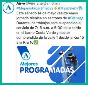 Continuando con las acciones de mejora en el municipio de Ciénaga y cumpliendo con los compromisos adquiridos por la empresa Air-e, este sábado 14 de mayo se realizarán trabajos de mejora en un sector del norte de la localidad.