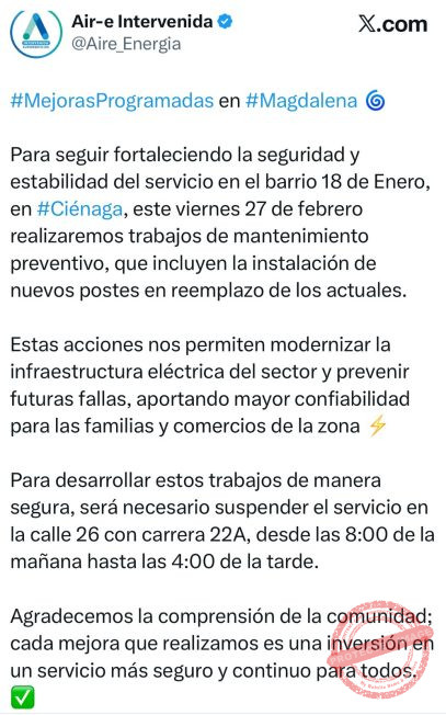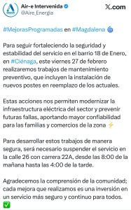 La empresa de energía Air-e informó que este viernes 27 de febrero llevará a cabo trabajos de mantenimiento preventivo en el barrio 18 de Enero, con el objetivo de fortalecer la seguridad y estabilidad del servicio eléctrico en la zona.