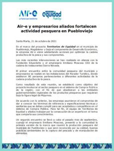 En el marco del proyecto Territorios de Equidad en el municipio de Puebloviejo, Magdalena- y bajo el componente de Desarrollo Económico, la empresa Air-e viene adelantando acciones por optimizar la cadena productiva de la pesca y sus componentes.