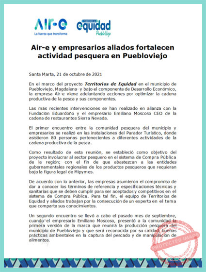 En el marco del proyecto Territorios de Equidad en el municipio de Puebloviejo, Magdalena- y bajo el componente de Desarrollo Económico, la empresa Air-e viene adelantando acciones por optimizar la cadena productiva de la pesca y sus componentes.