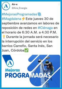 Por tal razón, se suspenderá la prestación de energía eléctrica desde las 6:30 am hasta las 4:30 de la tarde en los barrios CARREÑO, SANTA INÉS, SAN JUAN, CÓRDOBA Y ALEDAÑOS.