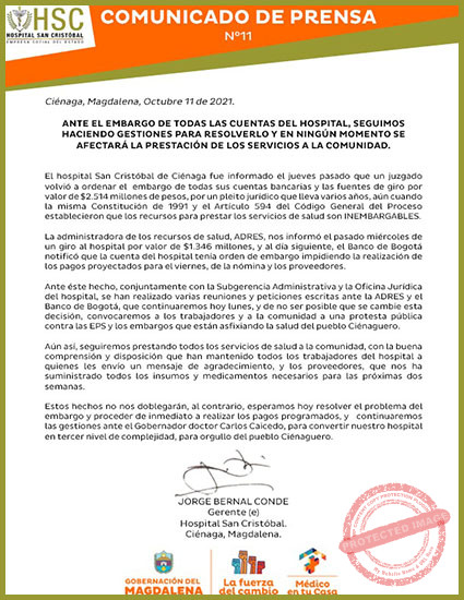 «Las reuniones continuarán este día lunes, y de ser posible que no se cambie esta decisión, convocaremos a los trabajadores y a la comunidad a una protesta pública contra la EPS, y los embargos que están asfixiando la salud del pueblo cienaguero» reza el comunicado.