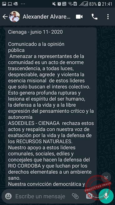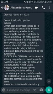 Por medio de la red Social whatsApp, el presidente de ASOEDILES, envía un comunicado dirigido a la opinión pública, sobre los problemas ecológicos que se vienen presentando en las últimas semanas, y además, según su declaración, las amenazas que se vienen presentando a los defensores del medio ambiente en la región de cordobita. Este medio informativo publica textualmente el comunicado para que usted esté bien informado.