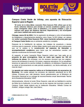 Con la aspiración de albergar a ocho mil estudiantes de Magdalena y departamentos aledaños como Cesar, la IES Infotep -en cabeza del rector Leonardo Pérez Suescún PhD- viene haciendo esfuerzos para que el Campus Costa Verde sea un ambiente académico completo.
