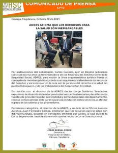 De acuerdo con el comunicado emitido el día de hoy, el Dr. Bernal, viajó a la cuidad de Bogotá con el fin de radicar en la ciudad de Bogotá, una solicitud escrita ante la Administradora de los Recursos del Sistema General de Seguridad Social, ADRES, en cabeza de su director Jorge Gutiérrez Sampedro, ante el cual se expuso la situación de embargo a todas las cuentas bancarias y las diferentes fuentes de giros del hospital San Cristóbal y demás hospitales del departamento, con sus consecuencias en la garantía para la prestación de los servicios, al afectar el pago de los salarios y los proveedores.