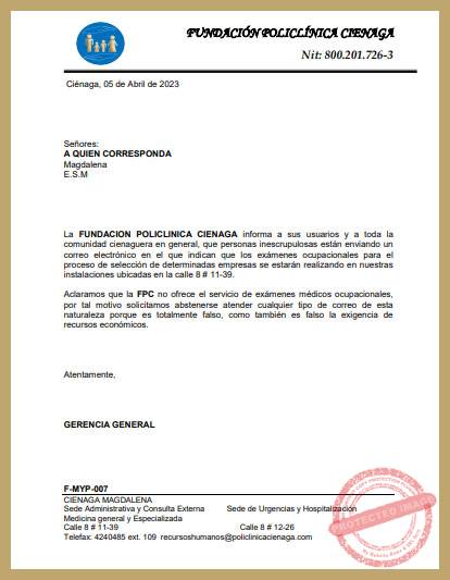 Mediante un comunicado de prensa, la Fundación Policlinica Ciénaga, pone en conocimiento a la opinión pública, que personas inescrupulosas, que se está presentando una metodología de fraude en el cual están enviando correos de parte de empresas privadas donde se les informa que en la dirección calle 8 # 11 -39 se están realizando estudios de medicina laboral y que para su realización deben consignar el 50% del valor de la consulta.