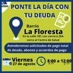 Nueva jornada  «AL DIA CON TU DEUDA» realizará Operadores este vienes en la calle 18C con carrera 26a del barrio la Floresta, con el fin de que usuarios quienes se encuentren en mora, puedan normalizar su situación con la empresa.