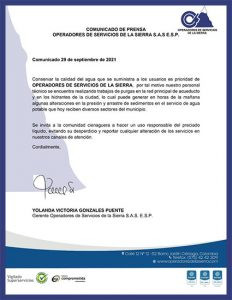 OPERADORES DE SERVICIOS DE LA SIERRA S.A.S E.S.P.Comunicado 29 de septiembre de 2021