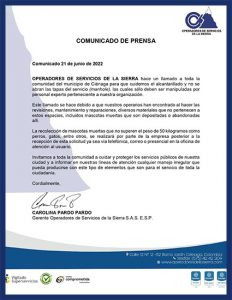 Invitamos a toda la comunidad a cuidar y proteger los servicios públicos de nuestra ciudad y a informar en nuestras líneas de atención cualquier manejo irregular que pueda producirse con este tipo de elementos que son para el servicio de toda la ciudadanía. Reza el comunicado, firmado por Carolina Pardo Pardo, Gerente Operadores de Servicios de la Sierra S.A.S. E.S.P.