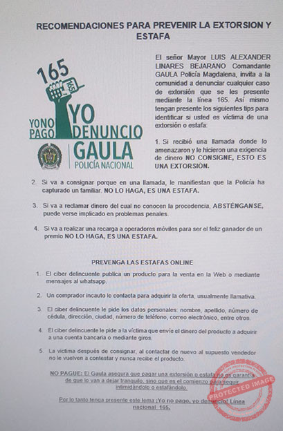 NO PAGUE: El Gaula asegura que pagar una extorsión o estafa no es garantía de que lo van a dejar tranquilo, sino que es el comienzo para seguir intimidando o estafándolo.
