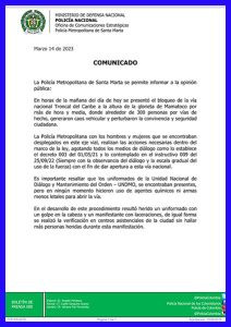 Por otra parte, la Policia metropolitana de Santa Marta, de acuerdo a su comunicado de prensa, manifiesta que solo hubo dos heridos, un uniformado con golpe en la cabeza y un manifestante con una laceración en la frente.