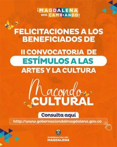 La Gobernación del Magdalena a través de la Oficina de Cultura da a conocer los resultados de la II Convocatoria del Programa de Estímulos de las Artes y la Cultura ‘Macondo Cultural’, que en su segunda versión entrega recursos por valor superior a los 539 millones de pesos.