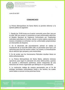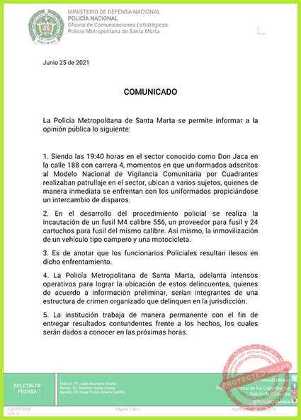 «La Policía Metropolitana de Santa Marta, adelanta intensos operativos para lograr la ubicación de estos delincuentes, quienes de acuerdo a información preliminar, serían integrantes de una estructura de crimen organizado que delinquen en la jurisdicción. La institución trabaja de manera permanente con el fin de entregar resultados contundentes frente a los hechos, los cuales serán dados a conocer en las próximas horas.» reza el comunicado