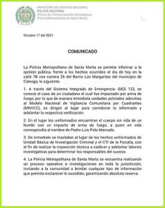 A esta hora Unidades de investigación de la Sijin del municipio de Ciénaga continúan con las labores operativas e investigativas, con el fin de establecer los móviles de los hechos, y la identidad de los autores materiales de los hechos, a la vez que se despliega el plan candado en todo el sector. La inspección y Levantamiento del Cadaver estuvo a cargo de la unidad investigativa de la Estación Ciénaga.
