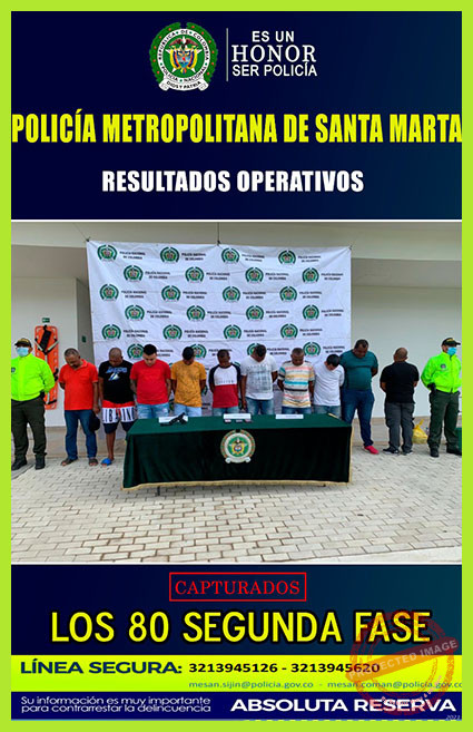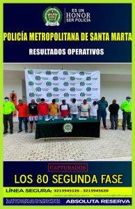 Durante este operativo se llevaron a cabo 11 diligencias de registro y allanamiento y se logró la incautación de un arma traumática, estas personas harían parte del Grupo de Delincuencial Común Organizada los 80 fase II y son los principales proveedores de sustancias estupefacientes de los lugares de expendios que se encuentran ubicados en diferentes comunas urbanas de la ciudad de Santa Marta, esta organización se encuentra al servicio del Grupo Delincuencial Organizado los Pachencas.