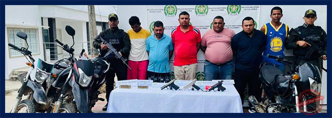 CAPTURADOS SEIS INTEGRANTES DEL ‘CLAN DEL GOLFO’ EN EL SUR DEL MAGDALENA – Golpe a la subestructura ‘Sergio Antonio Carrascal Gómez’ – Policía Nacional en coordinación con la Fiscalía y el Ejército, logró la captura de seis delincuentes, entre ellos dos cabecillas, incautando armas de fuego, motocicletas y equipos de comunicación.