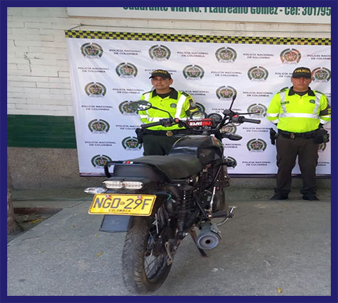- En Palermo, Magdalena en la vía Barranquilla – Santa Marta, tras el despliegue de actividades de registro y control, mediante la solicitud de antecedentes a vehículos, se logra la recuperación de una motocicleta; al verificar sus antecedentes, registra, el número de motor y chasis, regrabado. Se procede con los peritos de automotores de la Seccional de Investigación Criminal – SIJIN, en la revisión de su autenticidad, evidenciando que no es legible su identificación; al vehículo le reporta denuncia por el Presunto delito de hurto.
