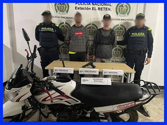 Adicionalmente, en acciones preventivas para la contención de las lesiones personales y el homicidio, tres sujetos fueron capturados por el delito de fabricación, tráfico y porte de armas de fuego o municiones. Dos de ellos en el municipio de El Retén y uno en el municipio de Plato, estas capturas se produjeron momentos en que policías de los cuadrantes los registraron y les encontraron armas de fuego, proveedores y municiones.