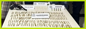 En medio de los registros las autoridades lograron incautar, un revólver calibre 38 milímetros, 15 cartuchos para pistola y revólver, 230 gramos de sustancias estupefacientes entre marihuana y cocaína.