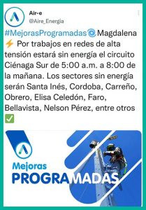 En comunicado de prensa, la empresa comercializadora de energía eléctrica Informa que el día de mañana 16 de mayo del presente año,   el servicio de energía será suspendido en el circuito Ciénaga Sur, de 5 de la mañana a 8 de la mañana, por labores de reposición y cambio de elementos en la red eléctrica.