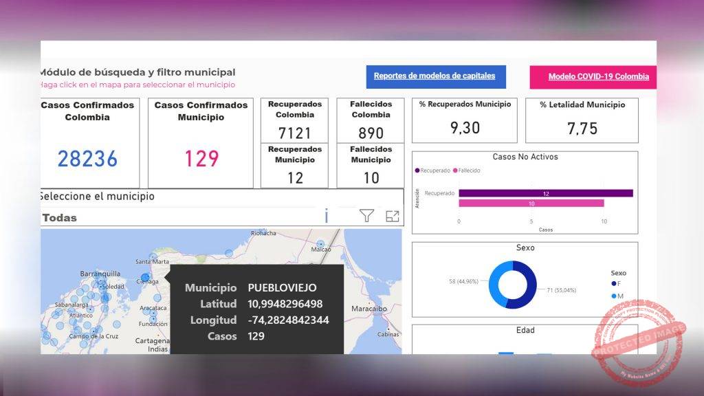 | 27621 | 2020-05-25 | 47189 | Magdalena | Ciénaga | 63 | M | En estudio | Hospital | Moderado | Colombia | 2020-05-20 | – – | 2020-05-30 | 2020-05-30 |
