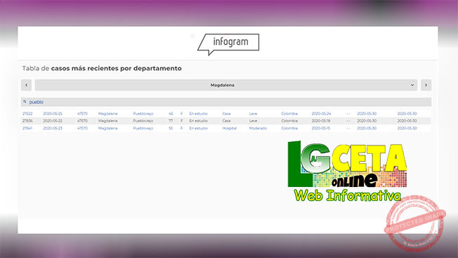 | 27620 | 2020-05-22 | 47189 | Magdalena | Ciénaga | 51 | M | En estudio | Casa | Leve | Colombia | 2020-05-14 | – – | 2020-05-30 | 2020-05-30 | |