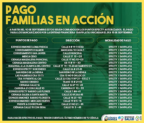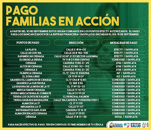 El Programa Familias en Acción, a través de su enlace municipal, Yolanda Vanegas, informa que se inicia el 4to pago por modalidad giro, a partir del día 10 de septiembre. Estos pagos serán cobrados en los puntos efecto autorizados.