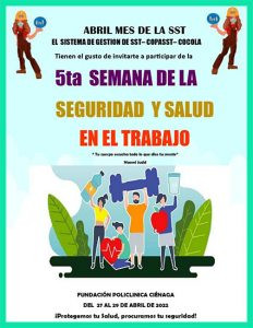 Por tal razón, la Fundación policlinica Ciénaga, a partir de hoy 27 de abril y hasta el 29 de abril, invita a la conmemoración de la semana de la SST, la cual dio apertura desde las 9 de la mañana, Las actividades consisten en charlas, jornadas físicas como la Rumbaterapia, alimentación saludable, etc.