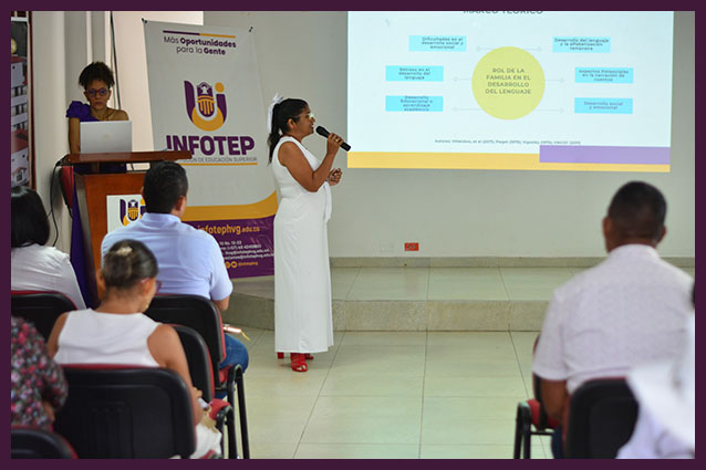 Dentro de esas experiencias, destaca la presentada por las investigadoras de Infotep, la decana de Humanidades, Mildred Ospina Pacheco, y la docente María del Carmen Bayona. Su ponencia ❞𝐄𝐟𝐞𝐜𝐭𝐢𝐯𝐢𝐝𝐚𝐝 𝐝𝐞 𝐮𝐧 𝐩𝐫𝐨𝐠𝐫𝐚𝐦𝐚 𝐩𝐚𝐫𝐚 𝐞𝐬𝐭𝐢𝐦𝐮𝐥𝐚𝐫 𝐥𝐚 𝐧𝐚𝐫𝐫𝐚𝐜𝐢𝐨́𝐧 𝐝𝐞 𝐜𝐮𝐞𝐧𝐭𝐨𝐬 𝐚 𝐩𝐚𝐝𝐫𝐞𝐬 𝐝𝐞 𝐧𝐢𝐧̃𝐨𝐬 𝐝𝐞 𝟎 𝐚 𝟕 𝐚𝐧̃𝐨𝐬❞. -❞𝐏𝐫𝐨𝐲𝐞𝐜𝐭𝐨 𝐌𝐚𝐭𝐞𝐨❞ , es una iniciativa que busca impulsar una dinámica social en la que la lectura juega un rol fundamental en la familia, el aprendizaje de los menores y su desarrollo en sociedad.
