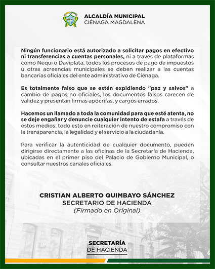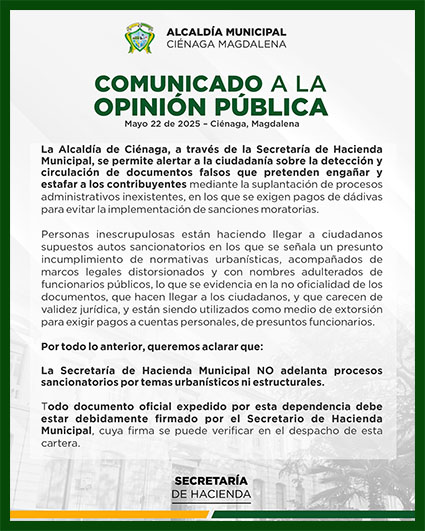 La Alcaldía de Ciénaga, a través de la Secretaría de Hacienda Municipal, informa sobre la circulación de documentos falsos que buscan engañar y extorsionar a los contribuyentes.