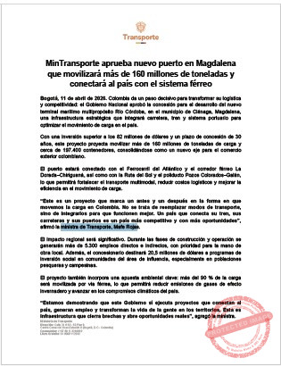El nuevo puerto Río Córdoba se perfila como un hito en la modernización del sistema portuario colombiano, al integrar carretera, tren y mar en un solo eje logístico. Con ello, el Gobierno Nacional reafirma su apuesta por un transporte multimodal moderno, eficiente y sostenible que fortalezca la competitividad del país y genere desarrollo en la región Caribe.
