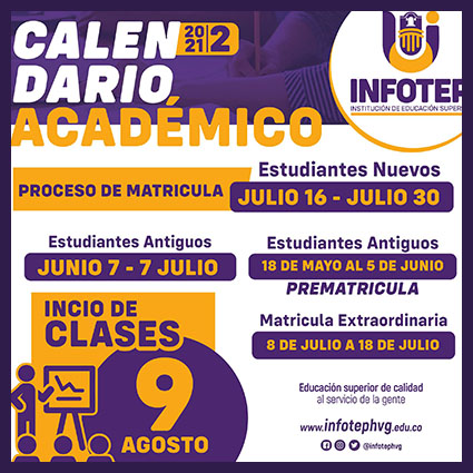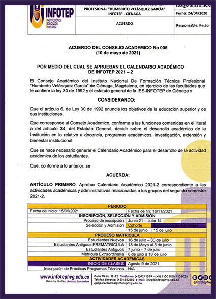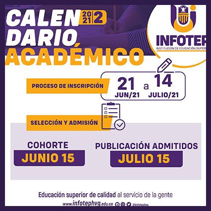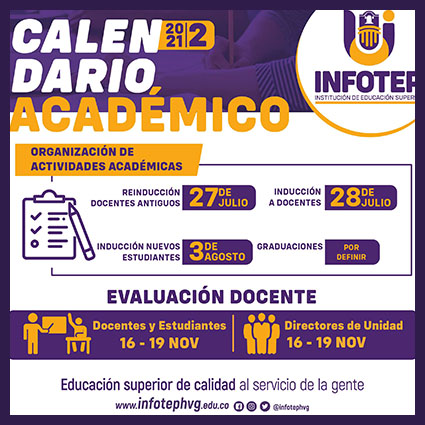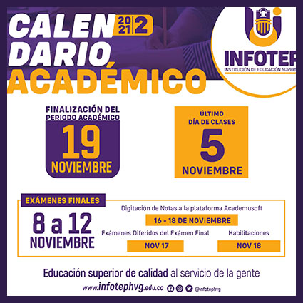 El instituto de formación Técnica Profesional INFOTEP, anunció mediante Acuerdo 005 -21 del 10 de mayo del 2021, que fue aprobado el calendario académico del segundo semestre 2021, correspondiente a las actividades académicas y administrativas relacionadas con el segundo período lectivo del Alma Mater.