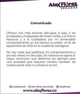 Además, solicitó al hotel Caribe de Cartagena, para que remita copia de los videos de cámara de seguridad o algún registro sobre los hechos sucedidos con el senador Alex Flórez.