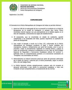 Tras recibir el llamado a través de la línea 123, uniformados de la Policía Metropolitana de Cartagena acudieron al lugar y fueron recibidos con improperios, insultos y señalamientos por parte del senador, ante lo cual se procedió a dejar el procedimiento registrado en material fílmico y aplicar la orden de comparendo, mediante lo establecido en la ley 1801 de 2016 (Código Nacional de Seguridad y Convivencia Ciudadana) artículo 35 numeral 1, tipificado como un comportamiento contrario a la convivencia consistente en “Irrespetar a las autoridades de Policía”.