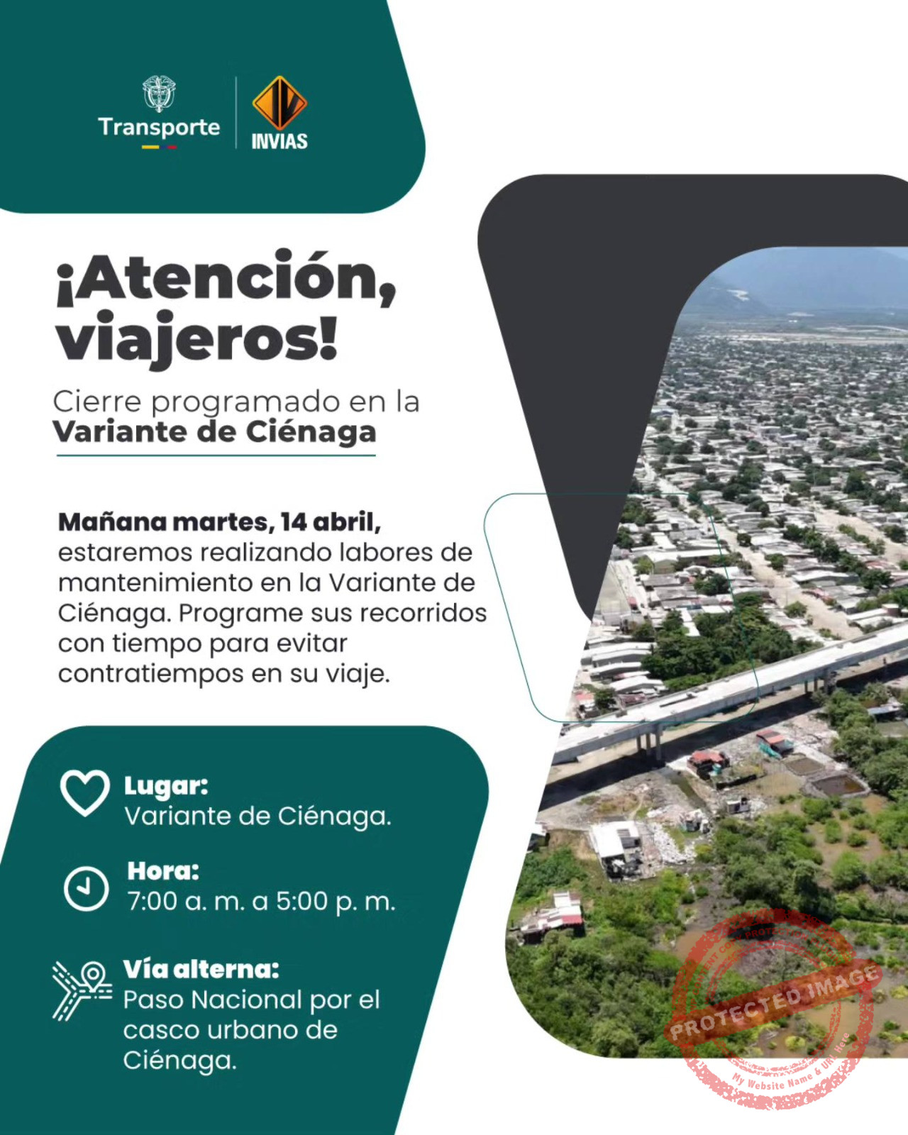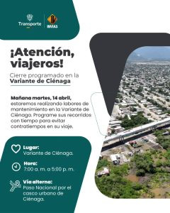 El Instituto Nacional de Vías (INVIAS) y el Ministerio de Transporte informaron que mañana martes 14 de abril se llevará a cabo un cierre programado en la Variante Sur de Ciénaga, debido a trabajos de mantenimiento vial.