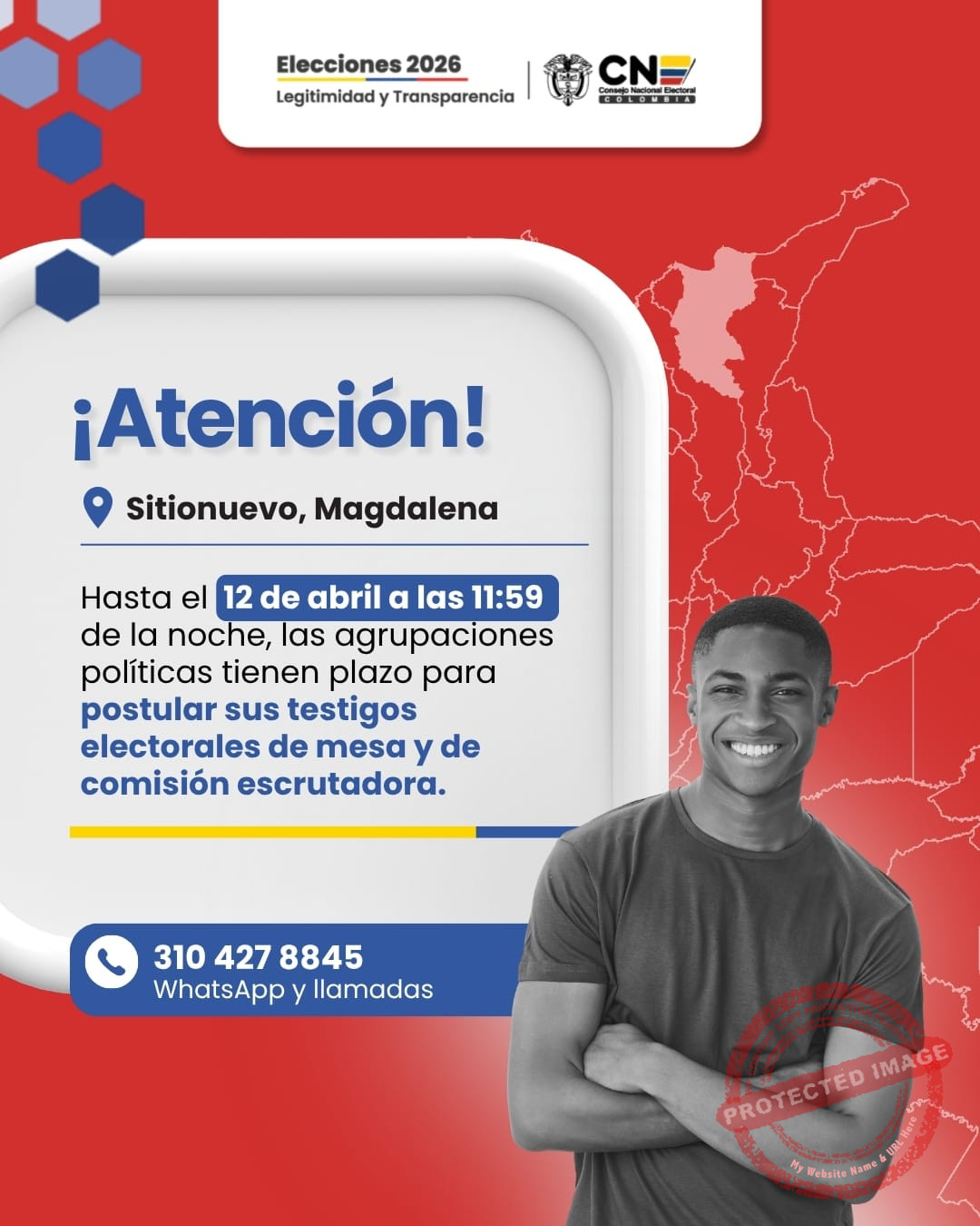El Consejo Nacional Electoral (CNE) anunció la extensión de la convocatoria para que partidos, movimientos políticos y organizaciones acrediten a sus testigos electorales en las elecciones atípicas de alcalde en Sitionuevo, Magdalena, programadas para el 19 de abril.