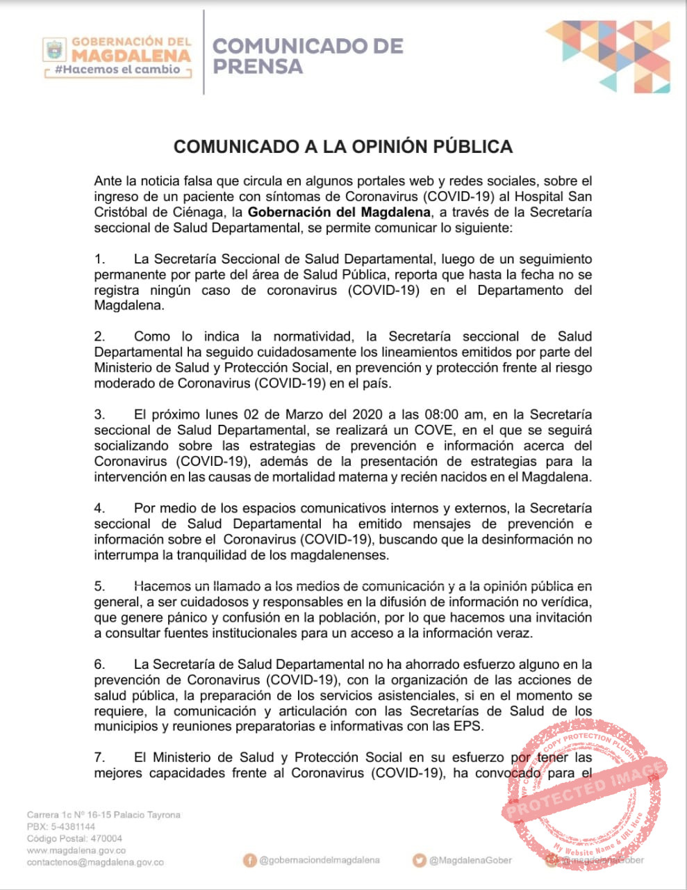 Al correo electrónico de este medio informativo. La Secretaria de Salud departamental, hace llegar un comunicado de prensa en el cual deja manifiesto que es falsa la noticia que circula en algunos portales y redes sociales, sobre presunto caso de coronavirus (COVID-19) en el E.S.E Hospital San Cristobal. Por tal razón , publicamos de manera textual la misiva para que usted esté bien informado.