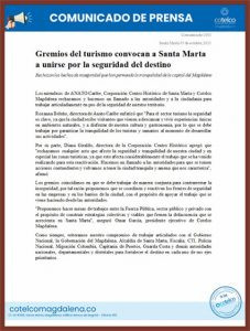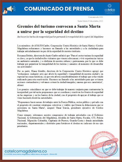 Los miembros de ANATO Caribe, Corporación Centro Histórico de Santa Marta y Cotelco Magdalena rechazan y hacen un llamado a las autoridades y a la ciudadanía para trabajar articuladamente en pro de la seguridad de todo el territorio magdalenense
