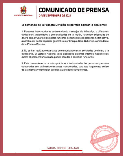 ¡INSOLITO!. A través de un comunicado de prensa, La primera división del ejército dio a conocer un estafa que se viene cometiendo a ciudadanos de buen corazón, quienes personas inescrupulosas le hacen exigencias de dinero a fin de aportar a una presunta obra benéfica.