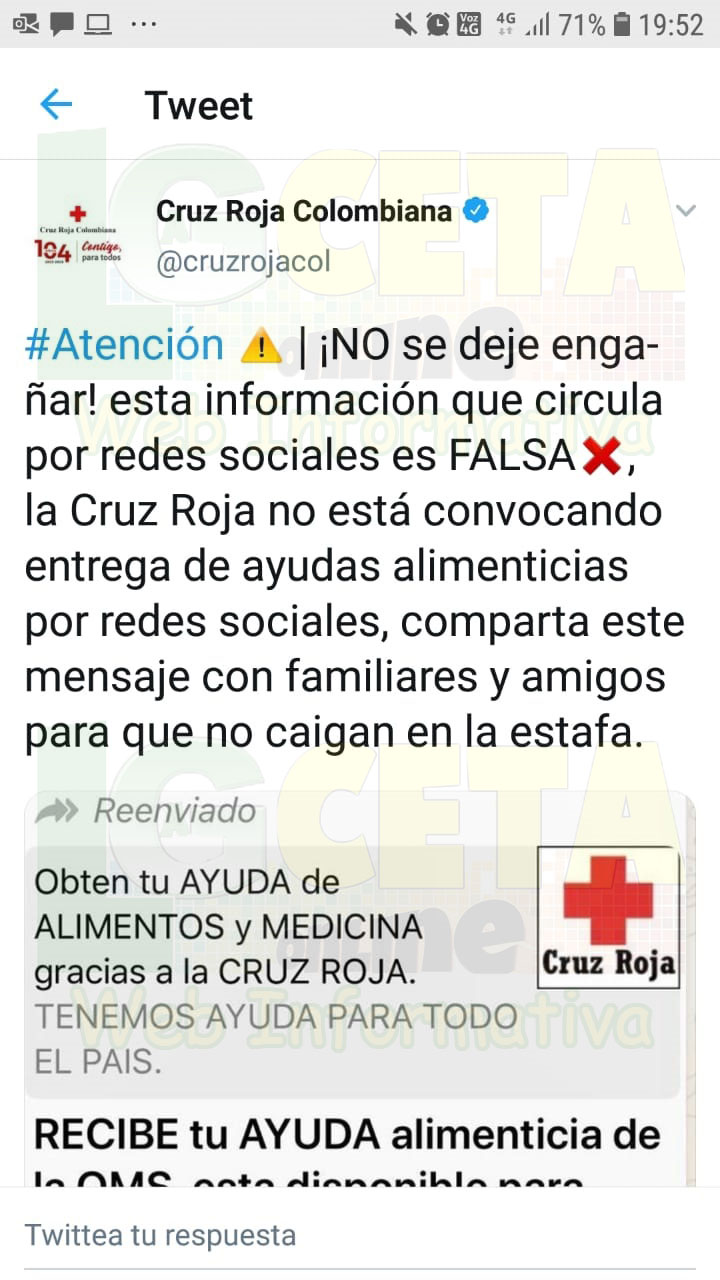 Por medio de la red social Whatsapp, nos envian un comunicado de un supuesto «TWITTER» informado sobre una entrega de ayudas , utilizando el nombre de la Cruz Roja colombiana, cosa que la misma entidad desmiente categóricamente.