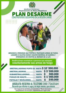 “Invitamos a toda nuestra comunidad a que se una a estas campañas y entre todos construyamos la seguridad en nuestra región caribe, en especial en el Magdalena, logrando prevenir la comisión de hechos delictivos con una oportuna información. Esta actividad es apoyada por las autoridades gubernamentales en desarrollo del plan de intervención y acompañamiento a los municipios, donde esperamos recibir armas de fuego, las cuales muchas veces son utilizadas para atentar contra la vida e integridad de las personas, por lo que se darán recompensa por la entrega voluntaria de estas armas”: concluyó el coronel Andrés Fernando Serna Bustamante, comandante encargado del Departamento de Policía Magdalena.
