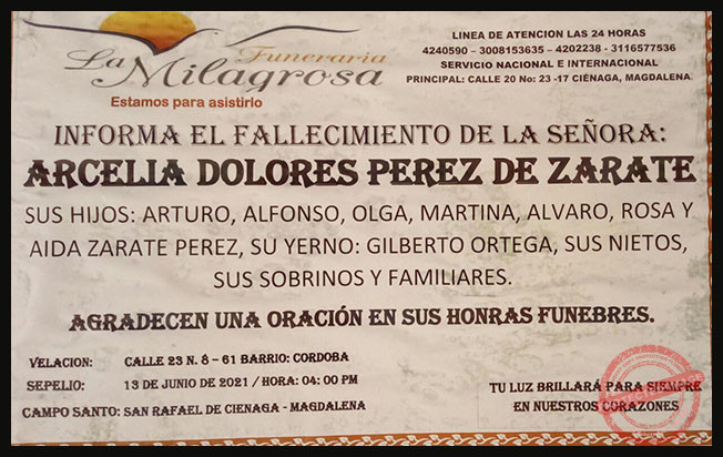 Este medio informativo lamenta el sensible fallecimiento de ARCELIA DOLORES PEREZ DE ZARATE, abuela, madre y mujer ejemplar. Nuestras más sentidas condolencias a sus hijos, nietos, sobrinos y demás familiares.