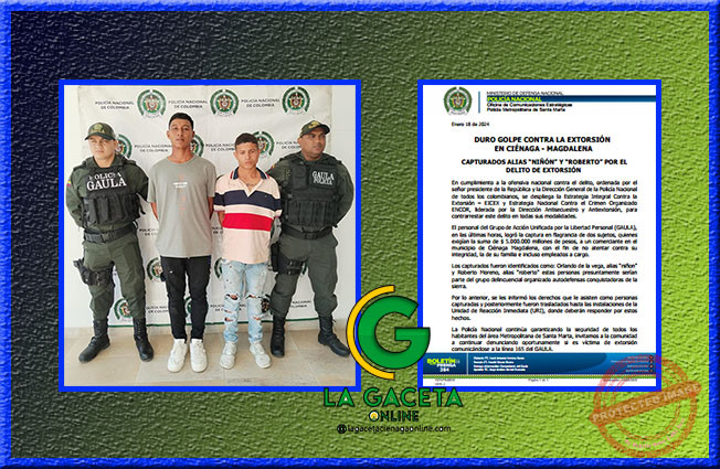 DURO GOLPE CONTRA LA EXTORSIÓN EN CIÉNAGA – MAGDALENA, CAPTURADOS ALIAS “NIÑÓN” Y “ROBERTO” POR EL DELITO DE EXTORSIÓN. En…